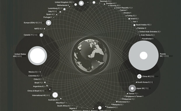 Aqui tenemos una genialidad más de Michæl Paukner, experto en dar mil vueltas a la realidad hasta convertir lo complejo en un fascinante diseño minimalista. Lo que hoy nos ocupa es un gráfico en el que se resumen los datos sobre satélites artificiales que orbitan la Tierra, su origen, estado y la cantidad de chatarra espacial vertida por cada nación. Toda una delicia, simple y directa. (Basado en datos de la UCS Satellite Database).