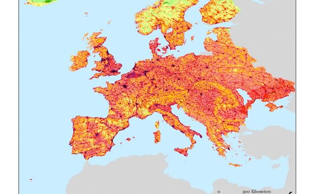 El siguiente ejemplo corresponde a la cartografía del proyecto para Europa, más concretamente el mapa referido a uno de los índices desarrollados para esta investigación, el Human Footprint (los otros índices o indicadores creados son el Human Influence Index y el Last of the Wild).