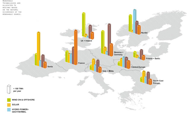 Esto es lo que propone la iniciativa Roadmap 2050, una tormenta de ideas encaminada a diseñar una Europa energéticamente independiente y neutra en cuanto a emisiones de carbono a la atmósfera se refiere. En esta fantasía, o experimento de prospectiva si se quiere llamar así, aparece nuestro continente dividido en regiones especializadas en varias áreas de la producción energética, como Solaria, Islas de los Vientos o Geotermalia, todas ellas unidas por una única red eléctrica común. Los mapas y gráficos que acompañan la iniciativa son realmente interesantes (puede descargarse todo el material en forma de documentos PDF en la web de la iniciativa).