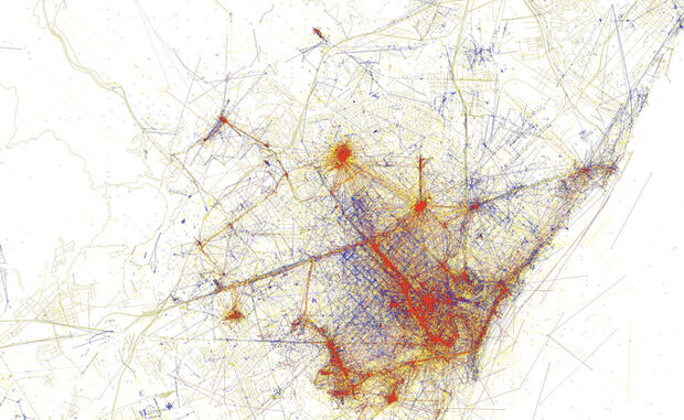 El resultado es visualmente muy atractivo pero, además, abre vías para continuar con análisis similares asociados a otro tipo de parámetros, como por ejemplo la distinción que hace el propio Fischer entre imágenes tomadas por locales (personas que han tomado fotos de una ciudad o localización a lo largo de un periodo de tiempo relativamente extenso) y turistas (personas que esporádicamente han fotografiado la ciudad) El ejemplo que he elegido para ilustrar este post pertenece a la ciudad de Barcelona.