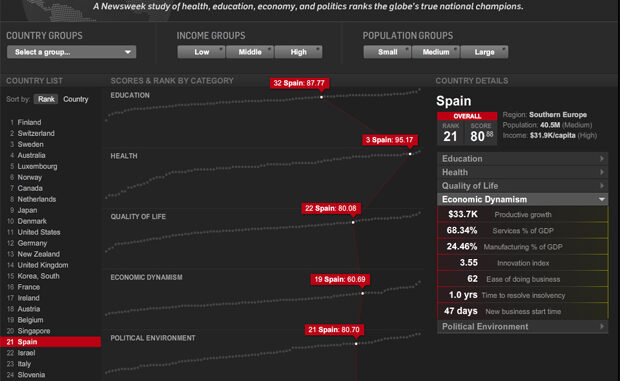 Al menos lo son si hacemos caso a ciertas estadísticas y a su forma de ser presentadas, porque ya se sabe lo que sucede con los números y los gráficos, se puede jugar con ellos de muchas y muy diversas formas. Newsweek ha presentado un gráfico interactivo, muy sencillo de utilizar (requiere Flash), que permite comparar diversos parámetros económicos y sociales para formar una especie de clasificación con los mejores países del mundo. A modo de curiosidad, España ocupa el puesto número 21. Por cierto, lo que es más importante en mi opinión, han tenido el acierto de añadir un apéndice metodológico en el que se detallan las fuentes de los datos y los métodos empleados en su elaboración.