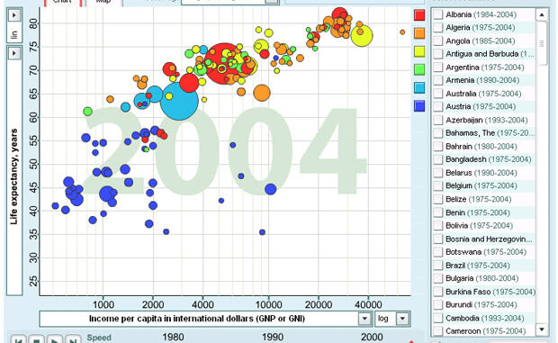 Novedoso sistema de presentación dinámica para gráficos que permite disfrutar de lo que, en otras formas de representación, sería algo bastante aburrido. A través de Gapminder se pueden contemplar diversos parámetros evolucionando en el espacio geográfico y en el tiempo: