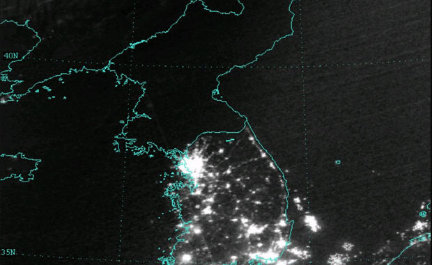Esta imagen nocturna de satélite vale por mil explicaciones. Mientras que Corea del Sur resplandece en la noche, mostrando su densa red de infraestructuras y su vitalidad, su vecino Corea del Norte vive en la más absoluta oscuridad. Ciertamente, el régimen de Kim Jong Il, no sólo ha dejado a oscuras la noche norcoreana sino que ha condenado a ese país a un pavoroso desastre que, valga la redundandia, también ha oscurecido con su brutal y estúpida represión todos los aspectos de la vida de sus ciudadanos. En la fotografía, la Península de Corea, donde puede verse sin necesidad de ninguna imaginación cómo el paralelo 38 separa dos mundos completamente diferentes.