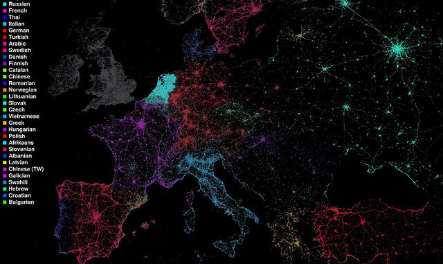 Los datos proceden de la Twitter streaming API, concretamente de registros tomados el día 14 de octubre de 2011. Hasta ahora hacer algo así era una tarea realmente compleja, pero la aparición de nuevas herramientas como cierto software para reconocer el uso de idiomas que funciona como complemento del navegador de Google, Chrome, permitió a Eric Fischer construir estos mapas. Pincha en las imágenes de los mapas para ampliar la vista. Véanse curiosidades como, por ejemplo, el clásico «agujero negro» en Corea del Norte. 😉