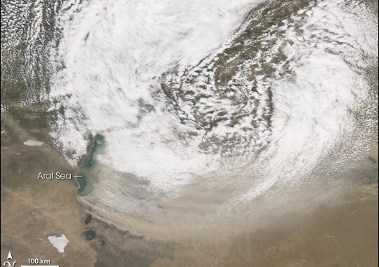 Gracias al espectroradiómetro MODIS a bordo del satélite Aqua de la NASA, podemos disfrutar de tomas impresionantes. En la primera, realizada sobre Asia central el 7 de Mayo de 2007, se puede observar una tormenta masiva de polvo en suspensión con dirección este partiendo del área que rodea al Mar de Aral.