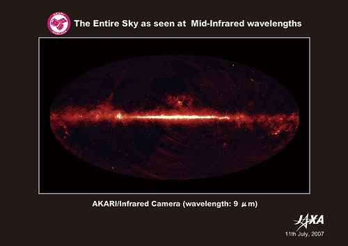 Enviado al espacio en febrero de 2006, el satélite de astronomía infrarroja AKARI (luz en japonés), también conocido como ASTRO-F, ha terminado la realización de un espectacular mapa del universo en la porción infrarroja del espectro electromagnético. Diseñado por la agencia espacial japonesa, JAXA en cooperación con diversos organismos europeos y coreanos, el satélite ha completado más de un año de trabajo y, con los datos recopilados, se ha elaborado esta mapa del universo infrarrojo realmente interesante.