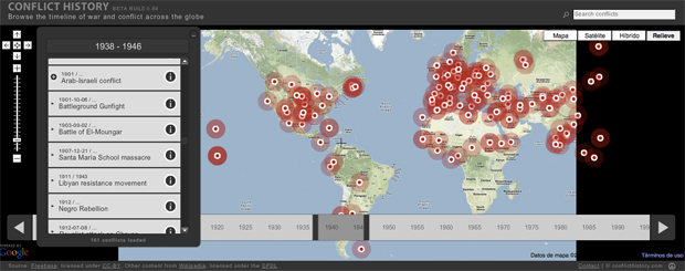 Parece un poco exagerado, pero esa parece la intención de este proyecto, a saber, cartografiar todas las guerras registradas a lo largo de la historia en un solo mapa interactivo. La idea, de TecToys, explota datos de varias fuentes, como la Wikipedia, de una forma atractiva visualmente. He de decir que en ocasiones me he perdido un poco al intentar saltar entre épocas y el interface me parece un algo complicado, pero la idea me atrae. También he localizado algunos errores en la presentación de la información, pero teniendo en cuenta que se trata de un proyecto vivo que va mejorando continuamente no es algo extraño. Como siempre, nada mejor que probarlo: conflicthistory.com