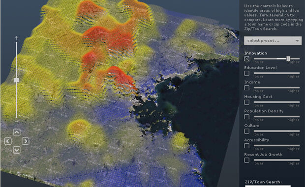 Desarrollado en java, el MIT Competitive Edge Landscape Tool propone una novedosa forma de dar a conocer datos de forma visual que, de otro modo, serían incluso tediosos de explicar. De forma interactiva, se visualizan los factores que ayudan a hacer del área de Boston uno de los más competitivos de su entorno y del mercado mundial. Sin duda, una propuesta atractiva que puede dar mucho juego a la hora de plasmar ideas complejas, como en este caso la de los factores de interés en cuanto a competitividad territorial se refiere.