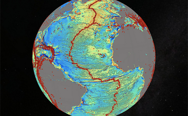 En la imagen puede observarse uno de los mapas que forman parte del proyecto de cartografía del lecho marino. Se trata de un modelo gravimétrico del Atlántico Norte. Los puntos rojos muestran localizaciones en las que se han registrado terremotos de magnitud superior a 5.5.