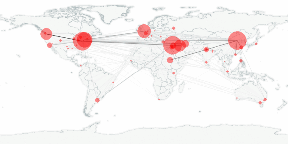 Por ejemplo, la cobertura mundial de noticias monitorizada por BuzzTracker en el momento de redactar este artículo se distribuye en varias zonas de concentración de información, mostrándose también la forma en la que se relacionan las áreas entre sí: