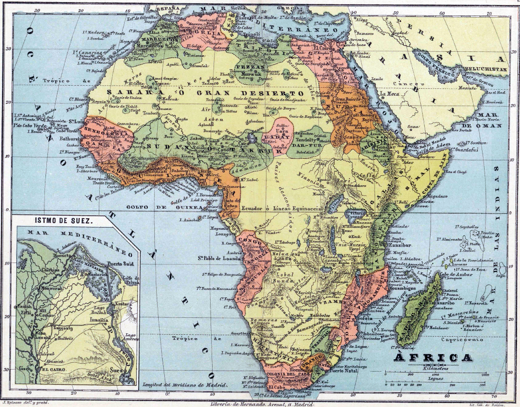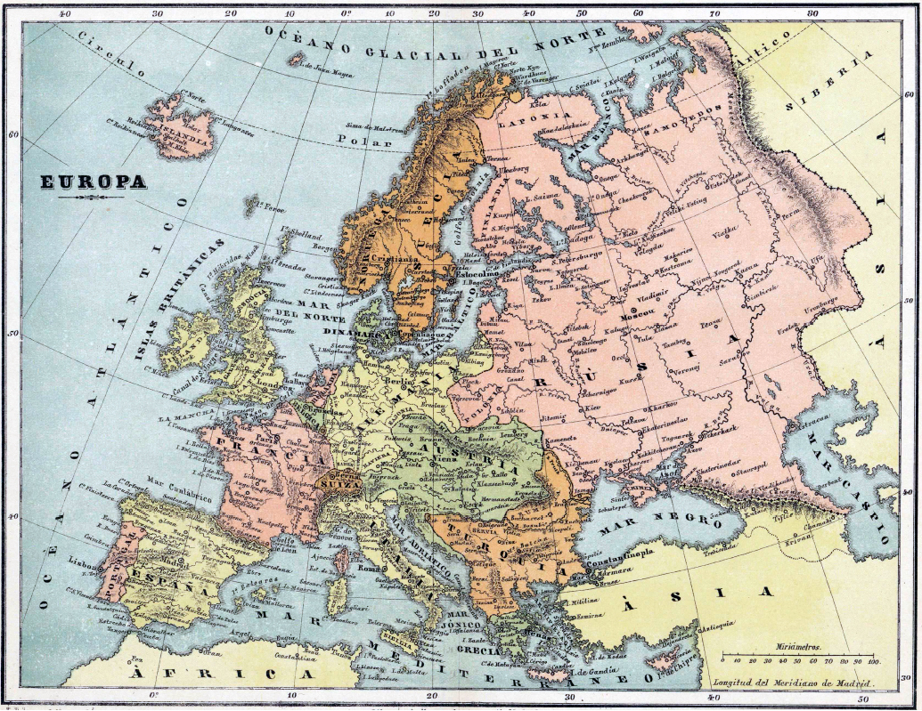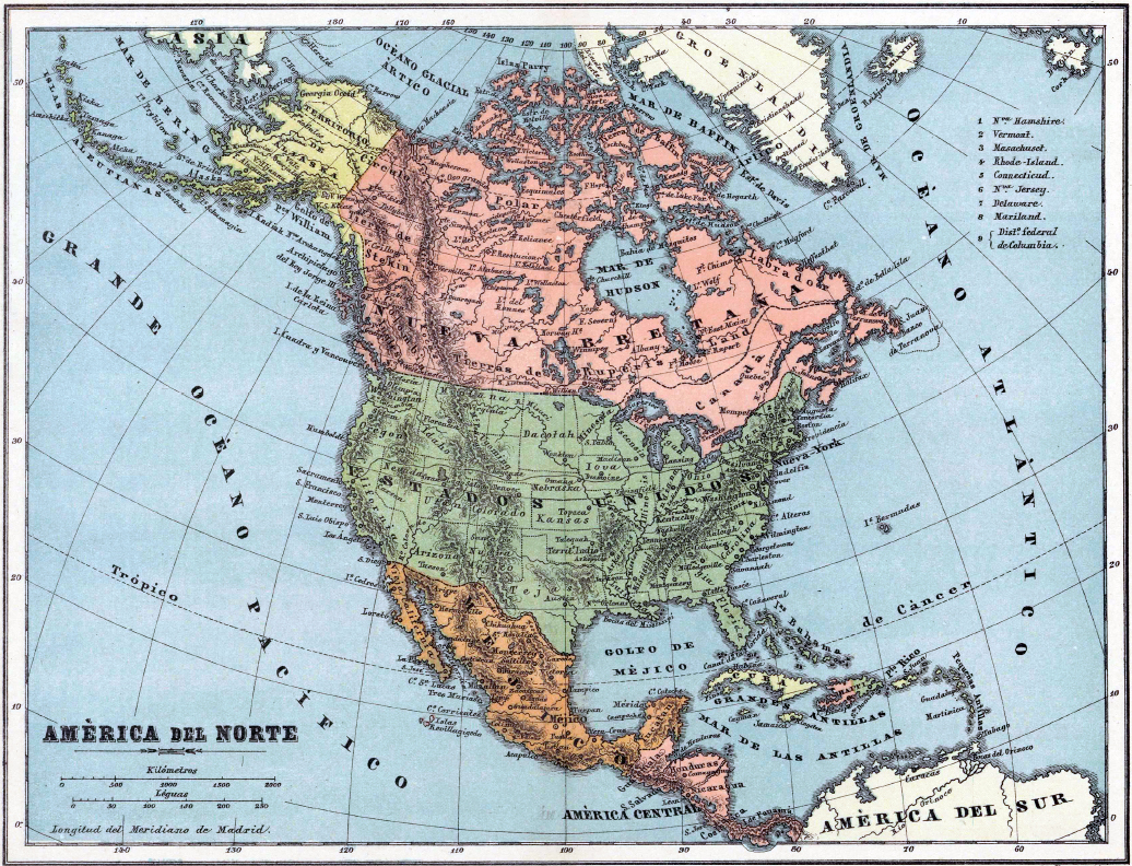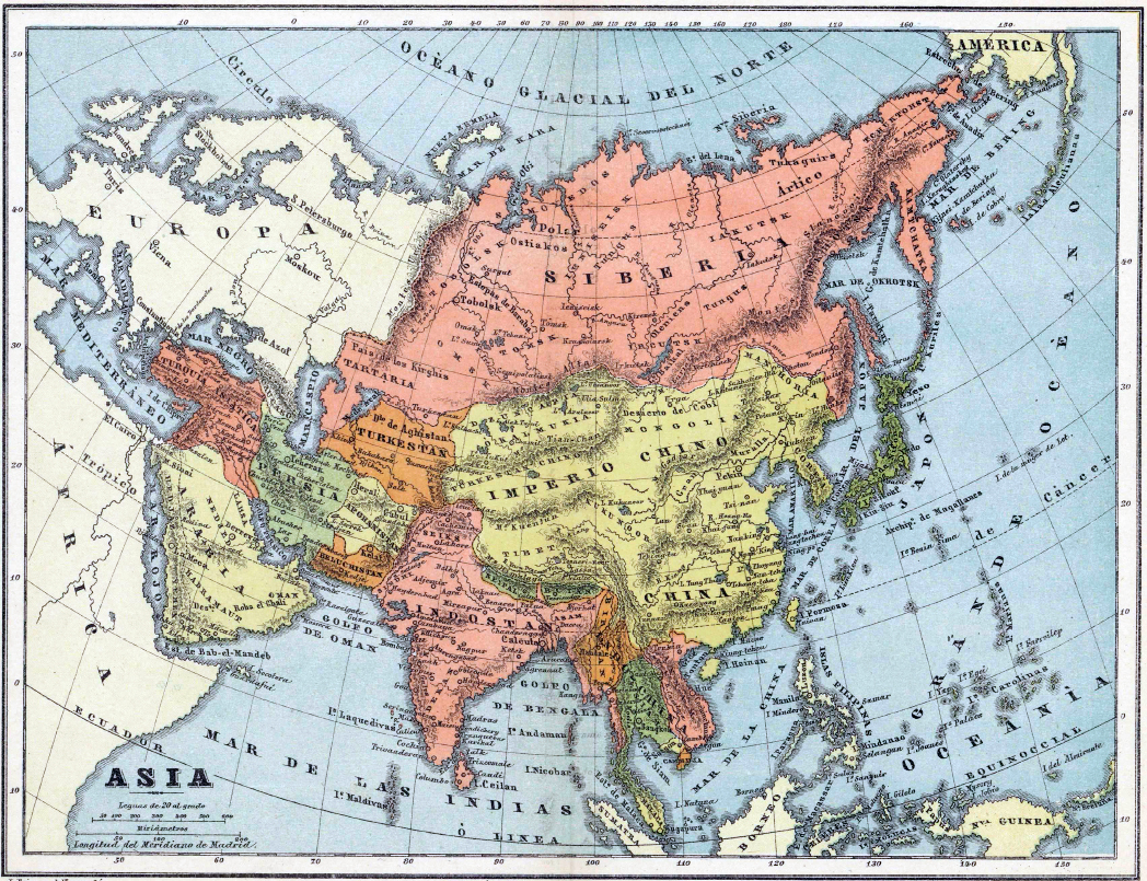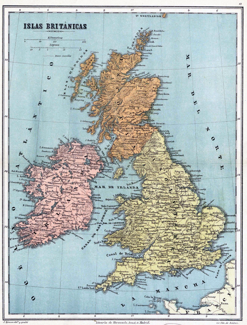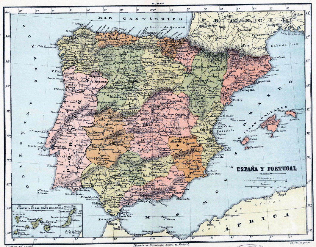 El caso es que, en el propio 1884, cuando se adoptó internacionalmente el Meridiano de Greenwich, el editor, grabador y cartógrafo José Reinoso quiso aportar su personal visión del mundo, ajustando sus mapas al Meridiano de Madrid. Así nació su Atlas Geográfico Universal en veinte mapas arreglados al meridiano de Madrid, que puede consultarse en la web de la Biblioteca Nacional, obra de la que traigo aquí alguno de sus mapas a modo de aperitivo.