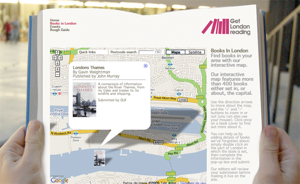 Esta iniciativa de Get London Reading explora el interface de Google Maps de una forma visualmente atractiva. Su objetivo consiste en localizar sobre un mapa de Londres libros relacionados con la ciudad, mostrando como marcadores las portadas de los mismos y ofreciendo detalles de cada obra. Además, se puede colaborar con el proyecto sugiriendo marcadores nuevos: