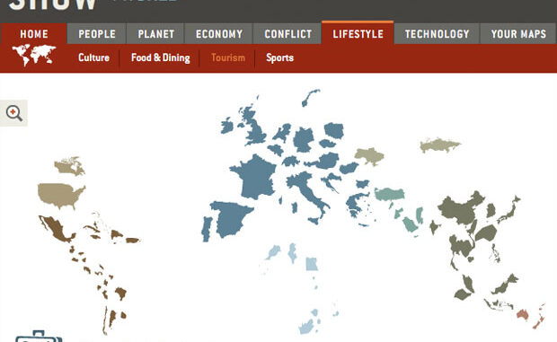 No se trata propiamente de cartogramas al estilo de otros que han visitado La Cartoteca anteriormente. En este caso, la novedad está en los «despieces» proporcionales, animados, con ampliación interactiva y presentación de datos mundiales proporcionados por Show World que, como bien explican, supone una forma novedosa de «conocer» el planeta. Se trata de una web interactiva en la que, eligiendo diversos parámetros basados en estadísticas globales, podemos crear mapas, descargar las tablas en formato Excel, se presentan libros y otros datos relacionados con el tema elegido… El menú estadístico en flash no tiene una usabilidad muy buena y la utilidad del conjunto es un tanto discutible pero, por lo demás, se trata de un sitio agradable y curioso: