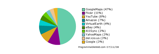 Un comentario de XuRxO, muy acertado como siempre, me trae a la cabeza varias conversaciones que he tenido con muchos desarrolladores. ¿Por qué narices siempre tenemos que usar Google Maps o Google Earth para llevar a cabo muchos proyectos? Naturalmente, también soy culpable, porque en varios proyectos bastante grandes hemos usado Google Maps. ¿Por qué? En primer lugar puede que sea por comodidad, se trata de una API bien conocida, explotada y que casi ha llegado a ser de la familia. En segundo lugar, vaya como curiosidad, porque algunos clientes lo exigen, puede que ver el dibujo de Google en la esquina inferior izquierda les haga confiar más en el proyecto o vaya usted a saber por qué. El caso es que Google Maps ha arrasado, no hay más que ver quién se lleva la mejor parte de la tarta de APIs por número de Mashups generados…
