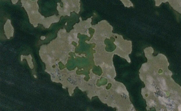 Pequeñas islas triples, en un lago de una isla doble, en Isla Victoria. Google Maps.