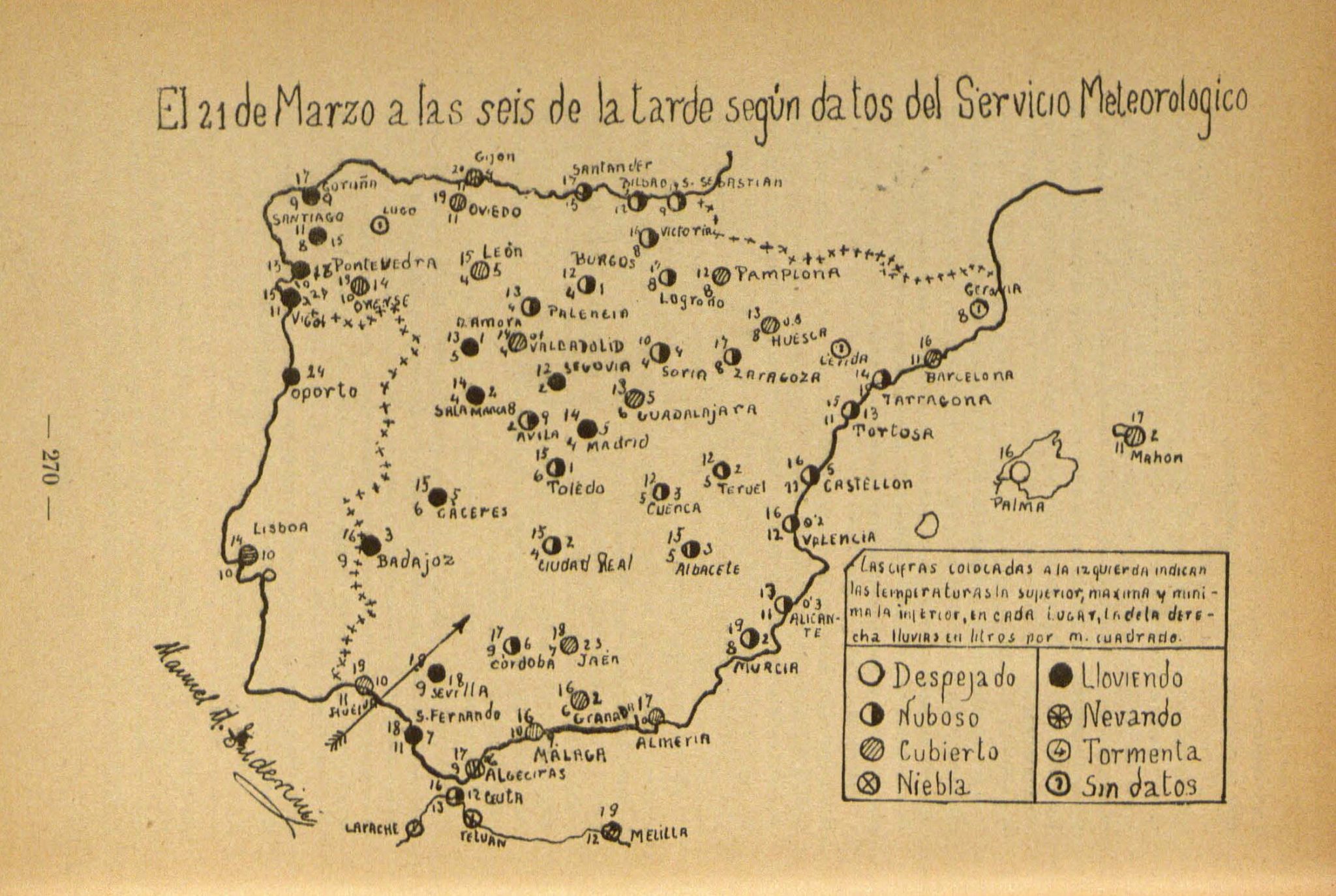 Poco más que añadir. El toque de plumilla, todo hecho a mano, añade un nivel de atractivo. Se trata de un mapa meteorológico que forma parte de un artículo sobre la didáctica de la geografía física que vio la luz en junio de 1936 en la revista Escuelas de España. Al poco, cuando comenzó la guerra civil, esta publicación dejó de existir, como tantas otras. La Biblioteca Nacional nos recuerda lo siguiente acerca de esta revista nacida de la pasión por la enseñanza de unos maestros ignotos: