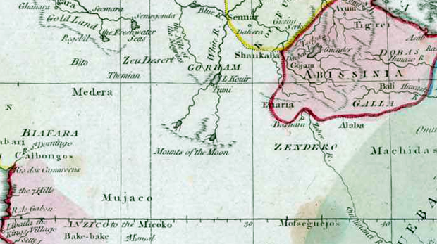 He aquí un detalle del mapa de John Cary centrado en las Montañas de Kong y los Montes de la Luna. (Pinchar en la imagen para ampliar).