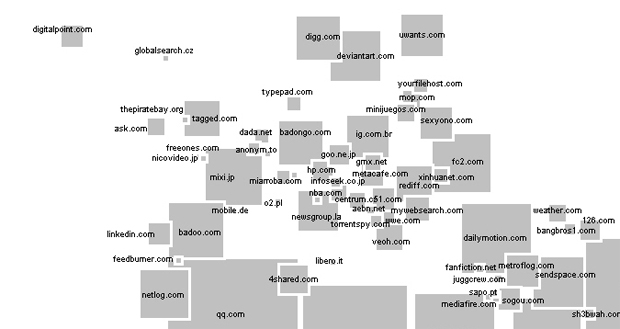 Me gusta esta idea, es divertida, más allá de que pueda ser de alguna utilidad, pero puedes pasar un buen rato explorando las islas más pequeñas. Se trata de convertir los perfiles continentales y los estados de nuestro planeta en una representación del terreno de juego de la World Wide Web. Se basa en datos del año 2007 proporcionados por Alexa y ComStore. Cuanto más tráfico haya tenido un sitio web, mayor será su tamaño proporcional en el mapa en relación directa a la superficie real de los países que «substituyen».