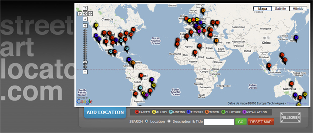 Como tantas veces se ha repetido aquí, cualquier cosa es cartografiable, los límites están fijados por la imaginación. He aqui otro ejemplo, streetartlocator, donde se pretenden localizar sobre un mapa diversas muestras de arte urbano a lo largo de todo el planeta:
