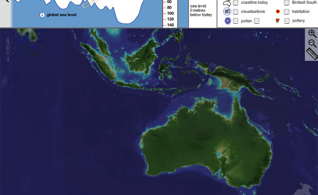 La australiana Monash University cuenta con un proyecto de representación visual interactiva que pretende mostrar la evolución cronológica de la plataforma continental Sahul, esto es, la gran masa de tierras emergidas que formaron Australia y Papúa-Nueva Guinea antes de que el nivel de los mares ascendiera hace unos 20.000 años y separara ambas tierras. De momento, se trata de un proyecto en desarrollo, pero ya cuenta con un módulo interactivo en el que podemos, por medio de un dial móvil, contemplar cómo cambió el nivel de los mares desde hace 100.000 años, dónde se han localizado poblamientos prehistóricos y otro tipo de datos, a través de un interface que simula la apariencia de vista desde el espacio ciertamente muy atractivo:
