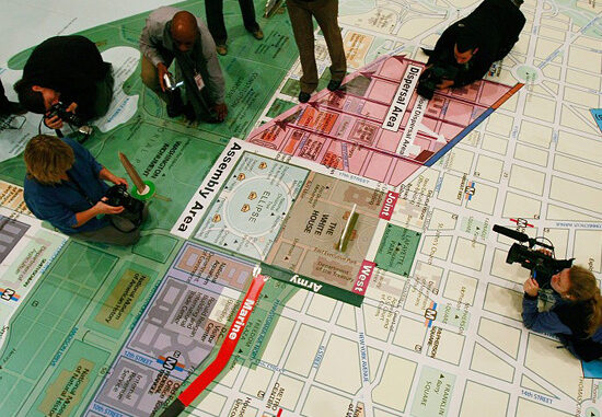 Quedan pocos días para que Obama recorra diversas calles de Washington, en una especie de procesión de automóviles solemnes y oscuros, para pasar a ser el nuevo presidente de los Estados Unidos. Este recorrido, ya tradicional, debe ser planificado al detalle por un gran número de agencias estatales, para que nada pueda salir mal, para que no haya problemas ni contratiempos. ¿Y cómo organizar a cientos de agentes de organismos diversos? ¿Acaso se emplea una sofisticada red de ordenadores con planos virtuales? Pues no, por lo que se ve, las viejas técnicas siguen siendo efectivas. Como si se tratara de un gabinete de guerra procedente de la primera mitad del siglo XX, los actores implicados en planificar y organizar tan memorable día utilizan una herramienta clásica: un mapa mural extendido en el suelo, con piezas móviles y un juego de formas y colores muy sencillo. Las imágenes hablan por sí mismas…