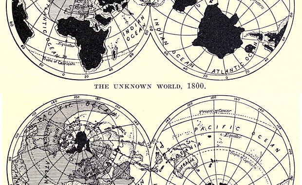 Revisando una vieja edición de Scientific American reference book, en concreto la correspondiente a 1905, he encontrado algunos mapas de sumo interés, como éstos que voy a comentar ahora brevemente. He realizado un montaje de dos mapas que aparecen en la página cuatro del citado libro, para formar la imagen que aparece más abajo. Los dos mapas muestran el estado de la exploración del planeta en dos épocas diferentes. En negro, las áreas consideradas inexploradas por los occidentales en 1800 y en 1900. Con superficie rayada, el área que era posible cubrir en tres semanas de viaje partiendo de Londres. Los mapas son lo bastante expresivos como para que no hagan falta acotaciones adicionales.