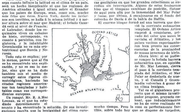 Lo que cambian las cosas. Hace unos días encontré el viejo recorte que he colocado más abajo. Ahora que uno de los temas de preocupación mundial es el calentamiento global y aparecen decenas de ideas sobre cómo controlar o contener sus efectos, resulta de un contraste chocante ver cómo hace apenas un siglo uno de los temas de moda era cómo lograr cambiar el clima para aprovechar tierras ocupadas por el hielo, o por los mares. Este recorte procede de la edición del 10 de abril de 1907 de la revista Alrededor del Mundo, tan interesante por su contenido como por el pintoresco estilo empleado, típico de la época y de esa clase de publicaciones ilustradas.