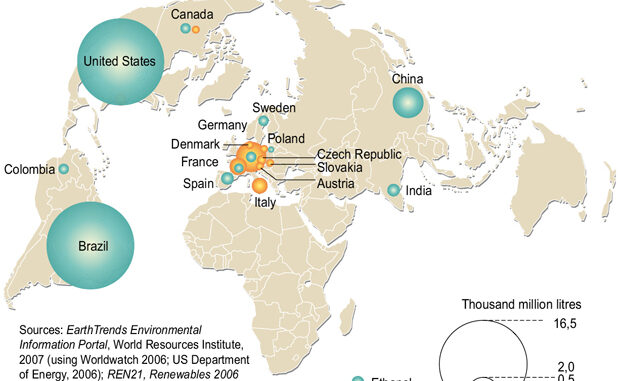 Datos: EarthTrends Environmental Information Portal, World Resources Institute, 2007 (using Worldwatch 2006; US Department of Energy, 2006); REN21, Renewables 2006 global status report, Worldwatch Institute; F. O. Licht world ethanol & biofuels report 2005