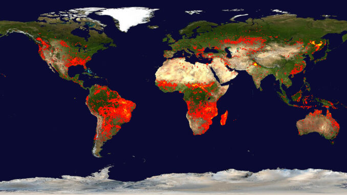 La imagen que ilustra este post muestra, sobre una representación global, los incendios, puntos rojos, que en los últimos diez días han detectado los satélites Terra y Aqua. Ofrecido a través del MODIS Rapid Response System Global Fire Maps, cada diez días se actualiza esta cartografía, formada por medio de un algoritmo para la detección de incendios desarrollado por Louis Giglio.