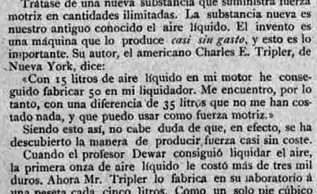 En la publicidad de la empresa de Tripler se afirmaba que la energía del futuro era el aire líquido. Muchos no se preguntaban de dónde salía el aire y la energía necesaria para licuarlo, porque los experimentos eran tan asombrosos que se les nublaba la mente. Tripler escribió sobre naves aéreas, barcos, locomotoras y hasta aparatos domésticos movidos con aire líquido. Curiosamente, aunque los sueños de Tripler no llegaron muy lejos, en esa misma época pudo verse circular una serie de vehículos animados por aire líquido. No eran muy prácticos, pero tenían su encanto. Pronto se pensó en usar aire a presión como propulsor, algo más sencillo de manejar que el aire líquido pero, claro está, menos espectacular. De aquellos intentos de explotar el aire líquido para mover máquinas poco quedó, sólo sombras de un futuro que nunca existió.