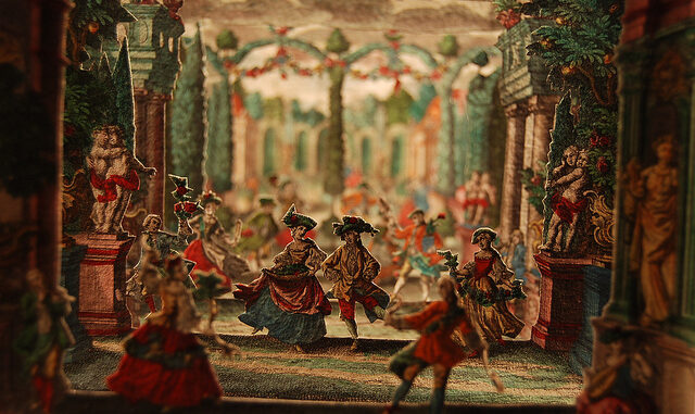 Libro en túnel creado por el aleman Martin Engelbrecht (1684-1756), formado por seis láminas de papel ilustradas a mano, recortadas para crear una perspectiva sobre una escena de baile en un jardín. (Smithsonian Institution Libraries).