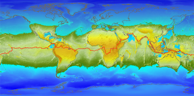 La respuesta del simulador es, cuando menos, sorprendente, aunque responde plenamente a lo que la física dicta. El mapa inferior ilustra lo que sucedería, en el imaginario caso de que la Tierra se «cansara» de girar en el espacio. La simulación muestra cómo, con la única presencia de la gravedad del planeta, como fuerza capaz de afectar a los océanos, el agua de éstos migraría hacia las regiones polares donde el campo gravitatorio es más fuerte relativamente en comparación con las áreas ecuatoriales, debido a la peculiar forma de geoide de nuestro mundo, esto es, una esfera ligeramente achatada en los polos. Así, nacerían dos grandes océanos polares y una gran franja central con tierras emergidas en paralelo a la región ecuatorial. La línea roja representa la divisoria entre los dos nuevos hemisferios según el balance de las aguas entre ellos. Naturalmente, ésto únicamente es un ejercicio imaginativo alejado de cualquier escenario real. 😉