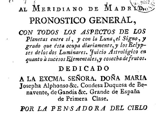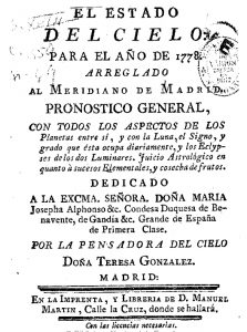 En la Biblioteca Nacional de España duerme desde finales del siglo XVIII cierto volumen con llamativo título: El estado del cielo para el año de 1778, arreglado al Meridiano de Madrid: pronóstico general, con todos los aspectos de los planetas, por la Pensadora del Cielo Doña Teresa González. Ahí es nada, estamos ante un almanaque astronómico, con ciertos tintes astrológicos.
