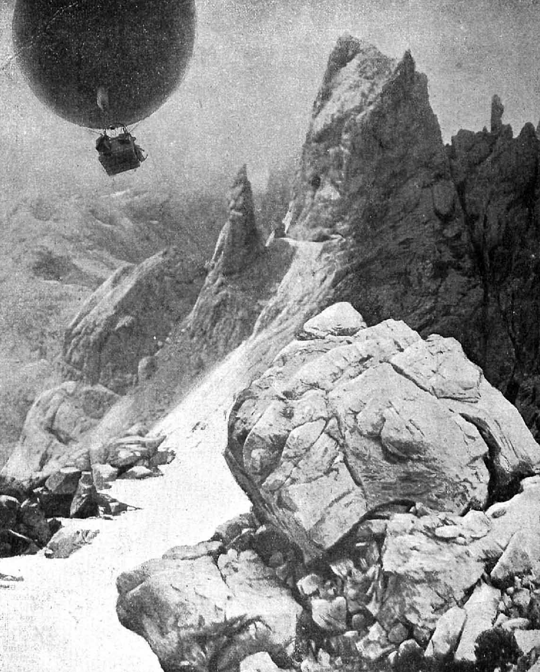 Sin decirnos nada (…) nos miramos uno a otro, y tras una mirada de inteligencia nos pusimos a contar los sacos de lastre que nos quedaban. Eran 13. Número escaso y un tanto de mal agüero, pero… Pirineos es una palabra mágica para cualquier aeronauta; reflexionamos que hay ocasiones que no se vuelven a presentar en la vida y… a los pocos minutos nos habíamos elevado a 2.000 metros sobre la Sierra de Guara, primera estribación del Pirineo, con sus imponentes desfiladeros. (…) Entramos francamente en el Pirineo a las siete y media de la mañana. Rozando el Cotielle a 2.900 metros nos dimos cuenta exacta de la empresa acometida. Por encima de Benasque (…) se nos interpuso ante el sol una nube densa y de gran tamaño. Estando a 3.800 metros sobre el nivel del mar empezamos a descender velozmente. El momento fue crítico. Soltamos dos sacos de lastre, sin poder contener la caída, y cuando nuestra emoción aumentaba en intensidad, logramos ver los rayos del sol…