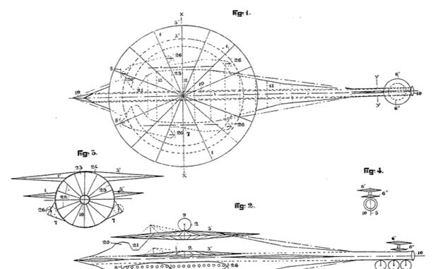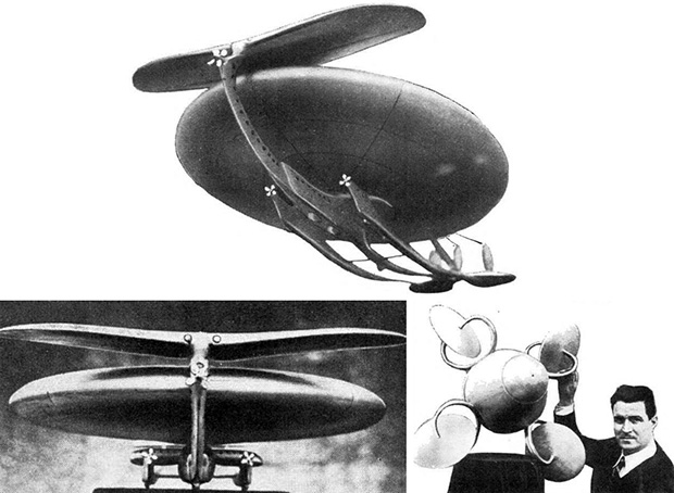 En la siguiente imagen puede verse una de sus maquetas y dos ilustraciones de concepto. En este caso la idea consistía en una nave-hidroavión (podía flotar como un barco), que volaba gracias a un ala giratoria llena de gas (hidrógeno o helio), o bien aire caliente.