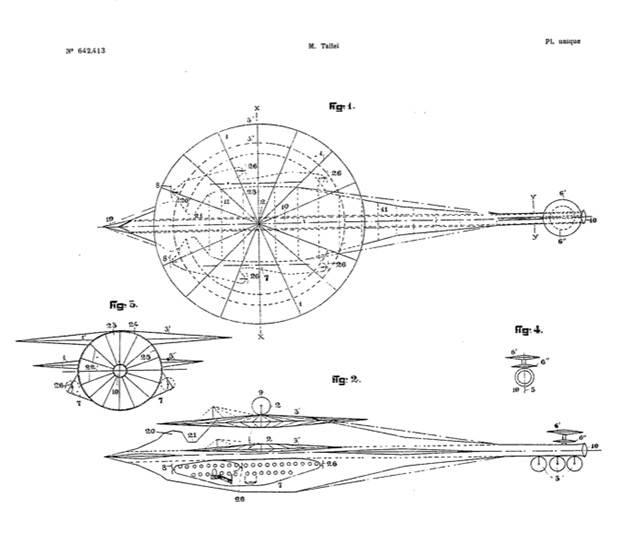 …se trata de un nuevo modelo de aparato volador que es una mezcla de dirigible, aeroplano y giróscopo. El cuerpo principal del aparato es un globo de forma achatada, lleno de gas, que unas máquinas neumáticas hacen girar aumentando sus condiciones de flotabilidad en el aire y su poder de elevación. Las hélices propulsoras son también de forma muy original. (…) En vez de palas, tienen discos que, además de girar alrededor del centro de la hélice, dan vueltas sobre su propio eje. El inventor afirma que su aparato es el más seguro de los construidos hasta el día, ya que se mantiene en el aire como un dirigible, alcanzando en cambio velocidades de aviones más ligeros. Además (…) gracias a su forma y al emplazamiento de las hélices, puede navegar.