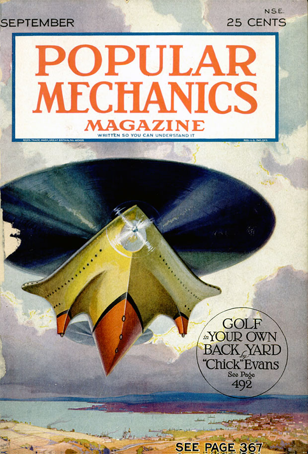 Guido imaginaba un futuro en el que naves híbridas, a medio camino entre el dirigible y el avión convencional, iban a surcar los cielos. Sus diseños discoidales, que no llegaron a materializarse en modelos reales, encontraron eco en algunas publicaciones de principios de los años treinta. He aquí, por ejemplo, la portada de la revista Popular Mechanics de septiembre de 1930, cuyo protagonista era uno de los diseños de Guido Tallei.