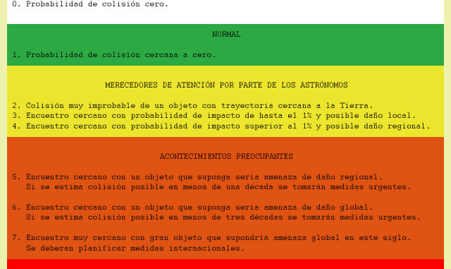 La escala de Turín -o Torino- fue ideada por el científico del MIT Richard P. Binzel a mediados de los años noventa para clasificar todos aquellos objetos cartografiados en el espacio cercano a la Tierra (NEO) según un índice de peligrosidad de impacto con nuestro planeta. Con el tiempo ha sido modificada y mejorada, tomando su nombre actual en el año 99, durante una conferencia internacional celebrada en Turín. Esta escala guarda cierto parecido con otras utilizadas en ambientes militares para medir el riesgo de confrontación, se divide en campos de color, desde la ausencia de peligro, en blanco, hasta el rojo, que implica colisión segura. Pueden econtrarse muchas fuentes en las que consultarse la escala, a continuación he desarrollado una versión muy simplificada de la misma, puede accederse a la escala completa a través de los diversos recursos que aparecen al final de este artículo.