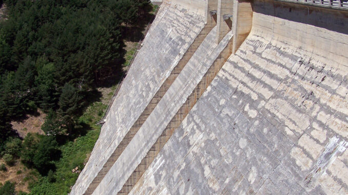 Al ver el gran lienzo de hormigón imaginé que unos grandes y coloridos mosaicos, además de alguna forma que sobresaliera del conjunto a modo de escultura flotante sobre el muro, serían ideales para dar vida a ese espacio «muerto». ¿Muros de embalses como soportes para obras artísticas? Me gustó la idea pero ahí quedó, como simple boceto en un viejo cuadernillo que ya no sé ni dónde estará guardado. Si hoy recupero la idea es porque llegué esta mañana a una imagen del embalse alpino de Tignes, en Francia, sobre el que aparece una monumental ilustración de Hércules esforzándose por mantener las peñas cercanas en su lugar. Se trata de una obra realizada en 1989 por Jean-Marie Pierret, para la que necesitó ayuda de varios escaladores profesionales. Actualmente es considerado el fresco de mayor tamaño del mundo (250×180 metros). La obra tenía un fin publicitario más que otra cosa, para promocionar el lugar para el año 1992 en que se celebraron las Olimpiadas de Invierno en la cercana Albertville. He aquí al gigante de Tignes.