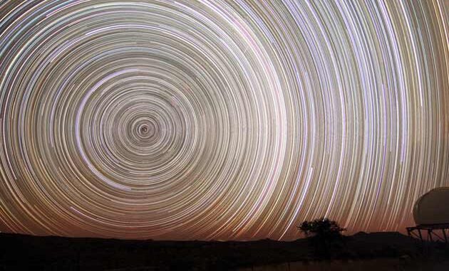 Cualquiera que haya mirado a las estrellas en una noche despejada, se ha dado cuenta de que, a pesar de mantenerse aparentemente «fijas» entre sí, las estrellas se mueven. Cada noche, aparecerán las mismas estrellas que en observaciones realizadas días antes, pero ligeramente desviadas de la posición en la que las vimos la primera vez en la misma hora. Esto lo sabe muy bien cualquier aficionado a la astronomía y sabe sacarle partido por medio de la astrofotografía. Una de las fotografías del cielo estrellado más espectaculares que puede realizarse, es la que registre ese movimiento del cielo. Como la Tierra gira, la «bóveda» celeste se desplaza, haciendo que las estrellas se muevan. Esta rotación aparente del cielo sobre nuestras cabezas, parece estar «fijado» en los polos. Hagamos pues la fotografía. Primero tomamos una cámara fotográfica que cuente con la capacidad de mantener el obturador abierto varios segundos o, mejor, de forma indefinida, por ejemplo mediante el uso de un cable disparador. Fijemos la cámara a un trípode, enfoquemos al polo norte celeste -al sur, si nos encontramos en el hemisferio austral- y disparemos… ¡Es importante elegir una noche y lugar donde la contaminación lumínica sea escasa! ¿Qué resultado obtendremos? Algo espectacular, una serie de trazos circulares que muestran el movimiento de las estrellas y el color de cada una de ellas. Hace tiempo -muchos años- realicé algunas tomas de este tipo, son muy fáciles de conseguir. Otra cosa es, con paciencia y técnica, lograr resultados como los de Josch Hambsch, tras más de diez horas de exposición en múltiples tomas. Una fotografía del cielo nocturno de Namibia, realmente espectacular: