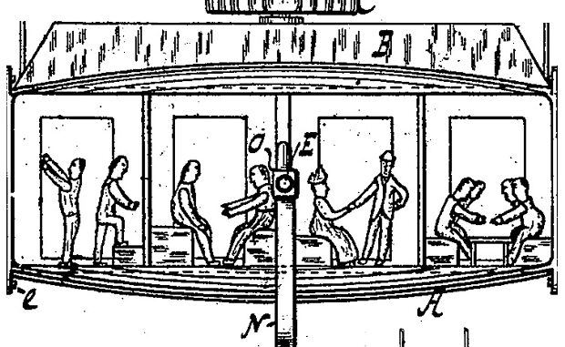 Esta es una de esas patentes que, de vez en cuando, muestran ideas adelantadas a su época y que, aunque no llegaron a buen puerto, dejan muy buena impresión. Como si de una narración steampunk se tratara, he aquí todo un simulador de vuelo ideado en 1893 por John F. Byrne. La idea se propuso para hacer que la gente que visitara exposiciones o parques de atracciones pudiera sentirse como volando a bordo de un dirigible. Si a la máquina se le unían paneles móviles en el exterior, o proyecciones de imágenes, como si de un paisaje artificial se tratara, la experiencia seguro que hubiera sido asombrosa para la época. Los gráficos de la patente dan idea de la propuesta, pero para más detalles es mejor leer la patente original.