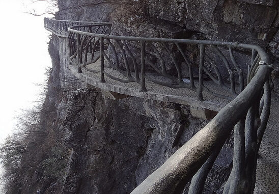 Pero, hay algo en esta pista elevada a cientos de metros de altura sobre el fondo del abismo que marca la diferencia y convierte a este lugar en algo muy especial. Toda una sección de la ruta se ha construido con una estructura metálica que sostiene un camino realizado con placas transparentes. Así, al caminar por la ruta que bordea la montaña, el visitante tiene la sensación de pasear flotando en el aire, con el fondo del valle allá abajo. Lo atractivo de la experiencia consiste, precisamente, en mirar hacia abajo, pero seguro habrá quien pase bastante miedo al recorrer este camino «invisible». 😉
