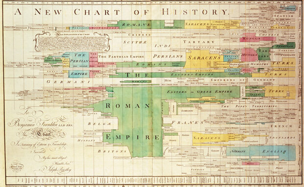 Durante mucho tiempo, e incluso hoy día, la huella que dejó la forma de representar la historia por parte de Joseph Priestley ha sido profunda. Priestley, que vivió entre 1773 y 1804, es recordado por ser codescubridor del oxígeno, por sus obras filosóficas y sobre educación y, también, por los muchos líos teológicos y políticos en los que se metió y que le obligaron a abandonar Inglaterra rumbo a los Estados Unidos. En una de sus obras más ambiciosas, Lectures on History and General Policy que data de 1769 a Priestley se le ocurrió dibujar en algo que hoy día llamaríamos infografía toda una visión de la historia del mundo para que el contenido del libro fuera más accesible. Se le ocurrió situar un eje para el tiempo y otro para diversas culturas, es más, contempló el mundo en su totalidad y no sólo a occidente, aunque éste ocupa el lugar más importante. Y, de esta forma, nació algo sorprendente para la época pero que hoy nos parece de lo más normal, a saber, los gráficos cronológicos que sirven para la enseñanza en historia, economía y en tantos otros ámbitos. He aquí esa pequeña maravilla, A New Chart of History, que mantuvo su reinado como representación de la historia humana durante buena parte del siglo XIX (pincha en la imagen para ampliar).