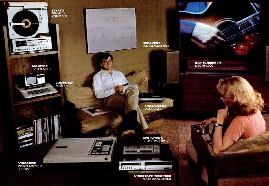 Me crucé ayer con este artículo de Popular Mechanics que fue publicado en diciembre de 1982. A lo largo de sus páginas se repasa la tecnología más avanzada de la época en lo que a entretenimiento electrónico en el hogar se refiere. El futuro parecía estar plagado de mil aparatos de todo tipo, y los años posteriores parecieron dar la razón a esa idea. Sin embargo, estoy seguro de que a las gentes de los ochenta (o sea, muchos de nosotros en el pasado) les hubiera sorprendido que allá a principios del siglo XXI sólo con un tablet o similar podrías tener todos los cacharros imaginables en uno solo. La imagen que he seleccionado de ese artículo es todo un resumen de una época, con videodisco y ordenador Apple II incluidos.