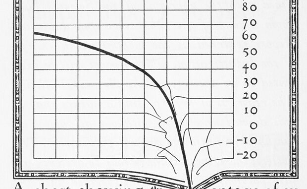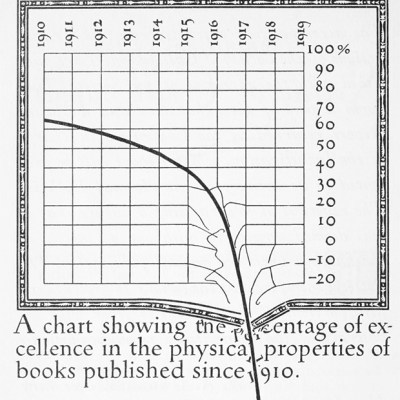 …¡desde hace casi un siglo! Al menos eso es lo que se intenta explicar1, con tono irónico y mucho humor, en un librillo publicado en 1919 por el calígrafo y diseñador editorial William Addison Dwiggins, junto a otros autores. Se pretendía mostrar su queja sobre la pérdida de calidad de los libros, tanto en los materiales empleados en el proceso editorial como en el uso de tipografías, maquetación y demás detalles. Todo el libro se puede resumir en el delicioso gráfico que aparece en su comienzo, una genialidad que expresa una idea compleja de un vistado. Un gráfico rompedor, ni más ni menos… ¿Qué pensaría Dwiggins de los libros electrónicos?